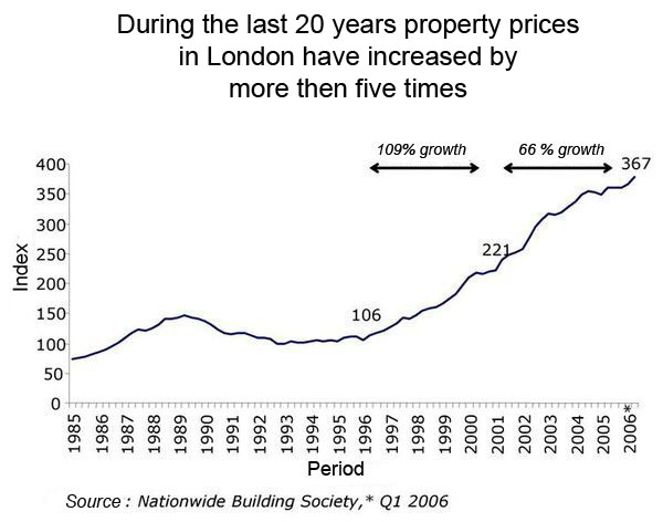 Anche tenendo conto della flessione dei prezzi di mercato nel 2008, la crescita media annuale degli immobili a Londra negli ultimi 20 anni i e' del 10%